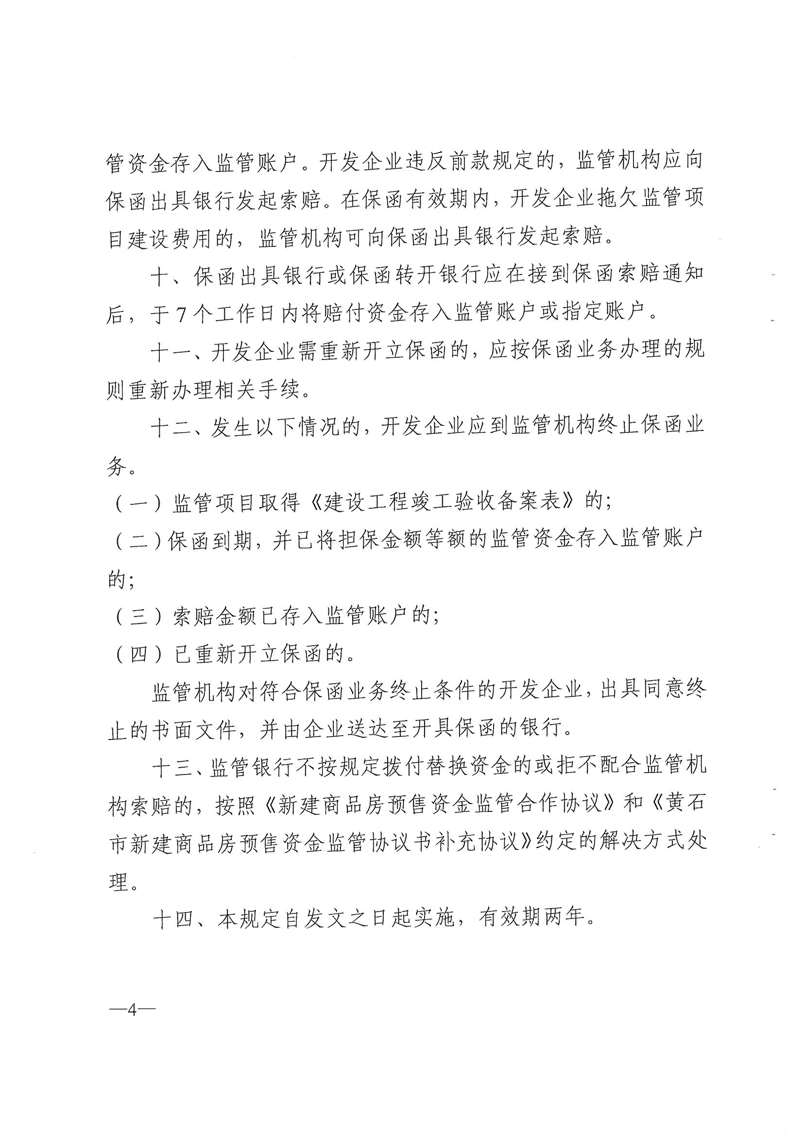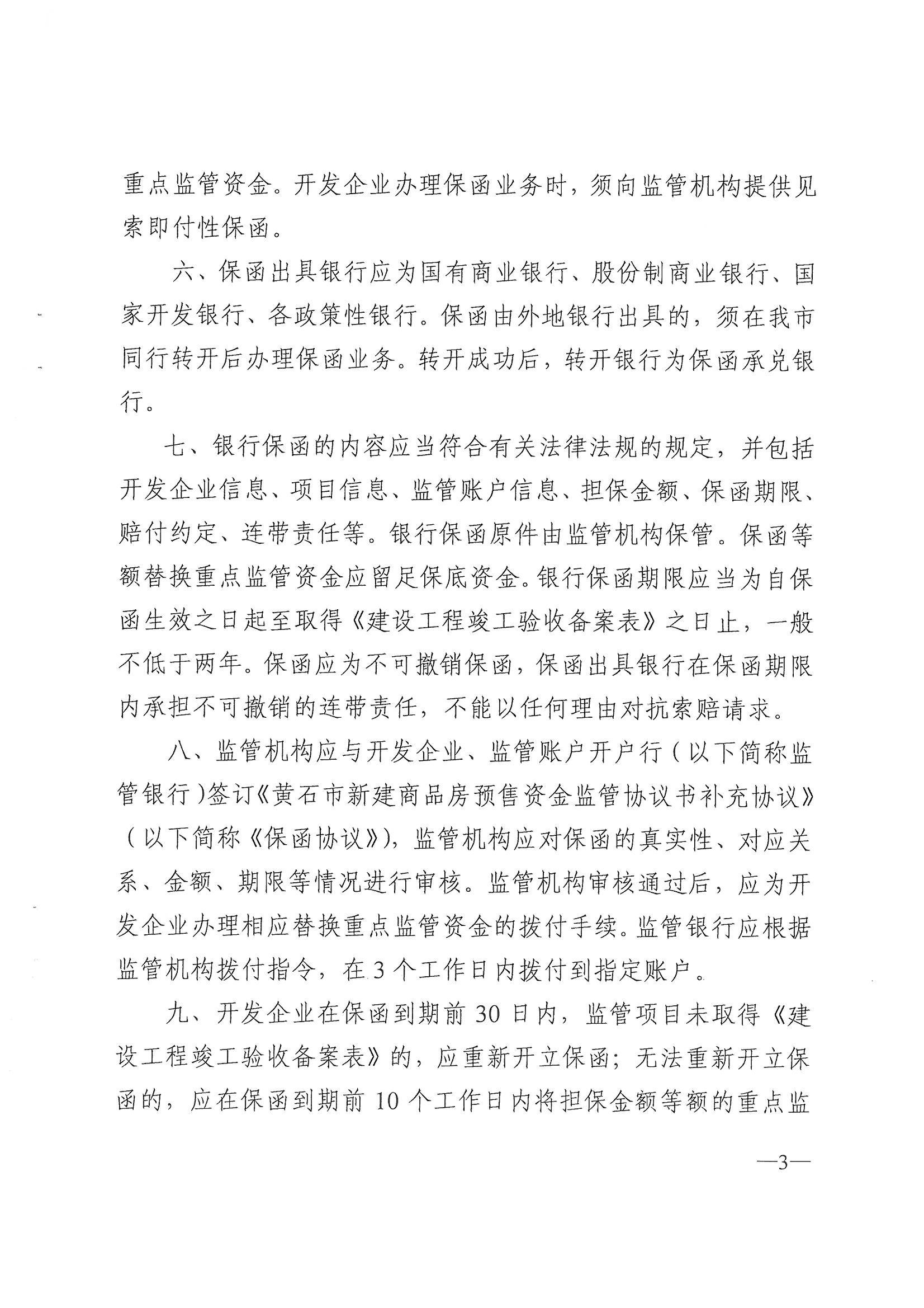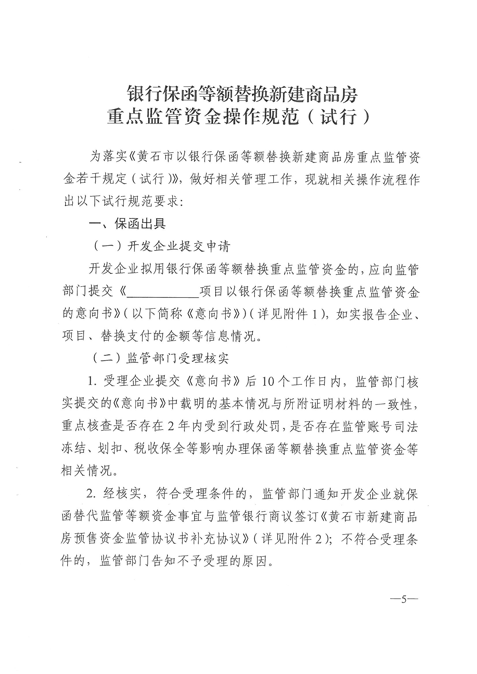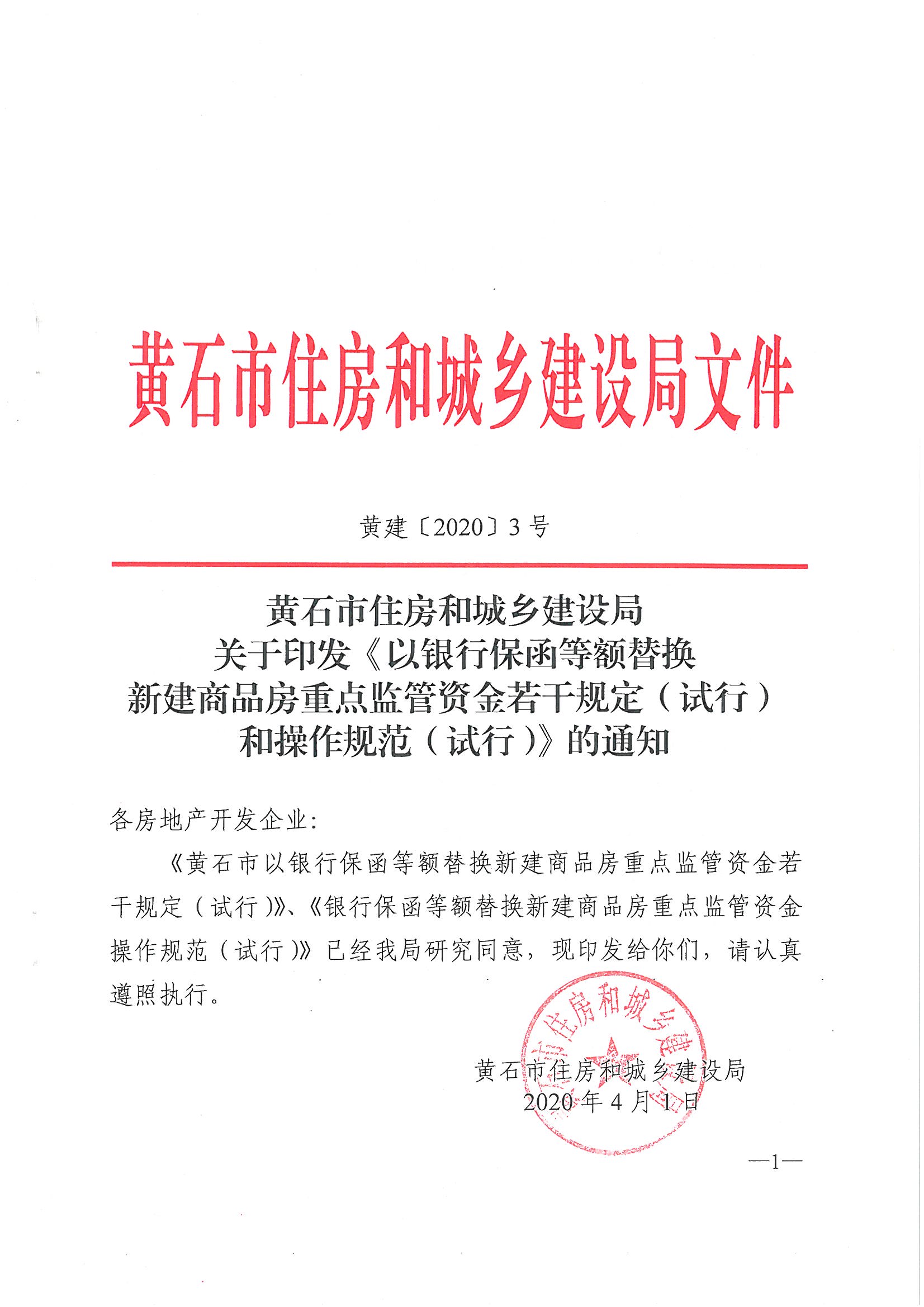 黄石市住房和城乡建设局关于印发《以银行保函等额替换新建商品房重点监管资金若干规定(试行)和操作规范(试行)》的通知