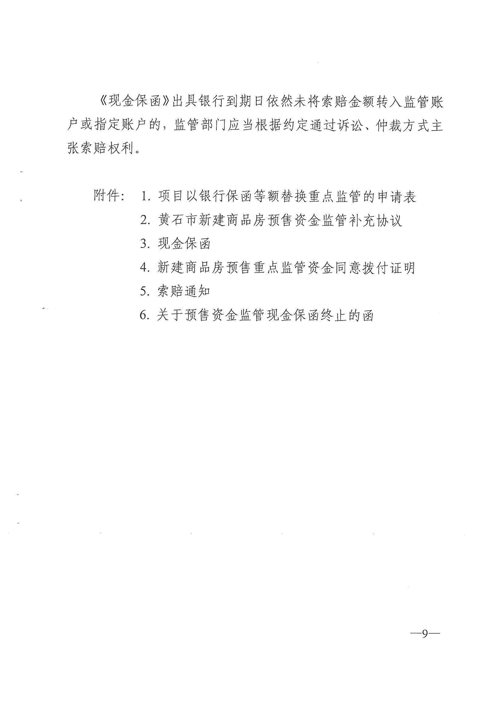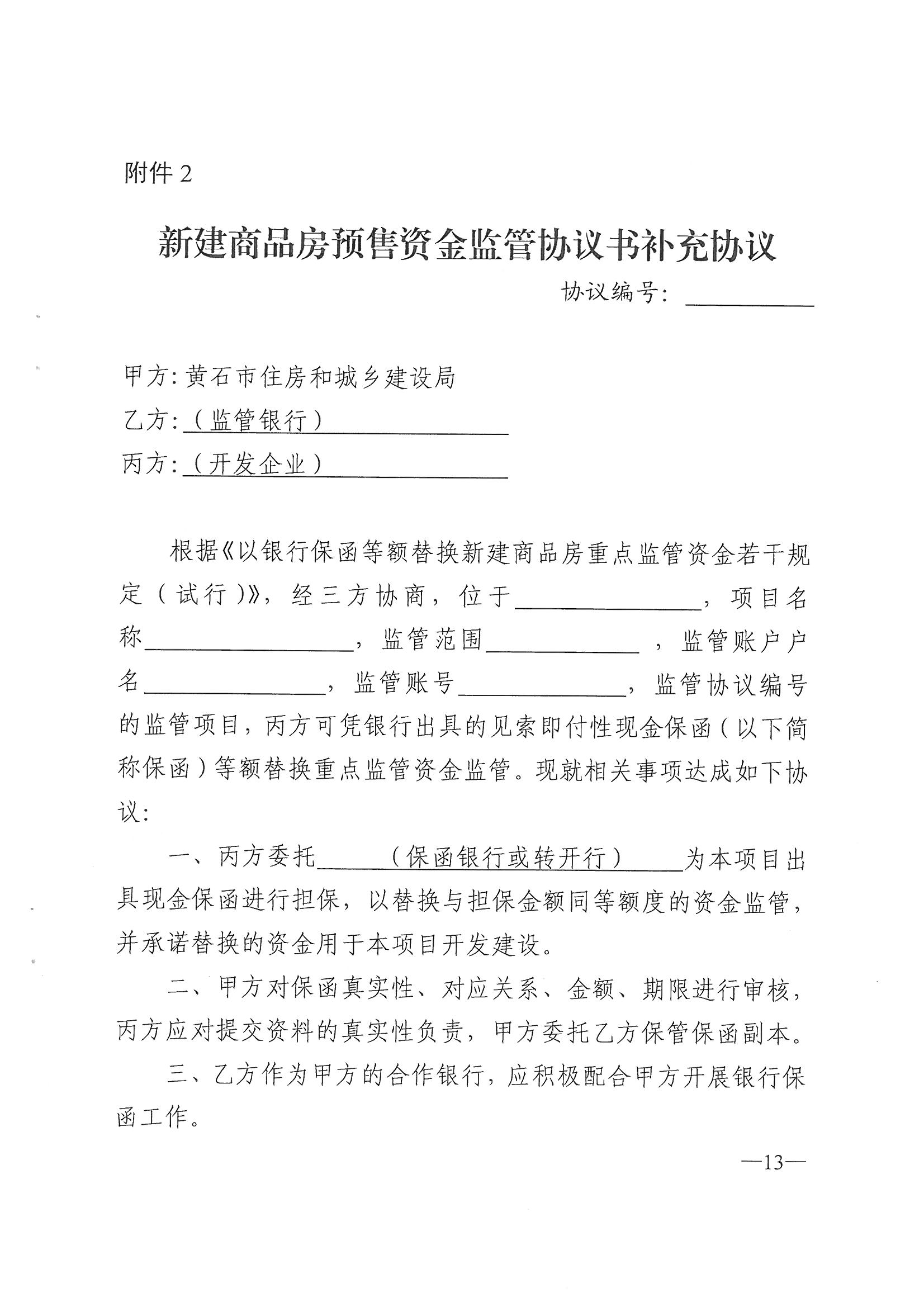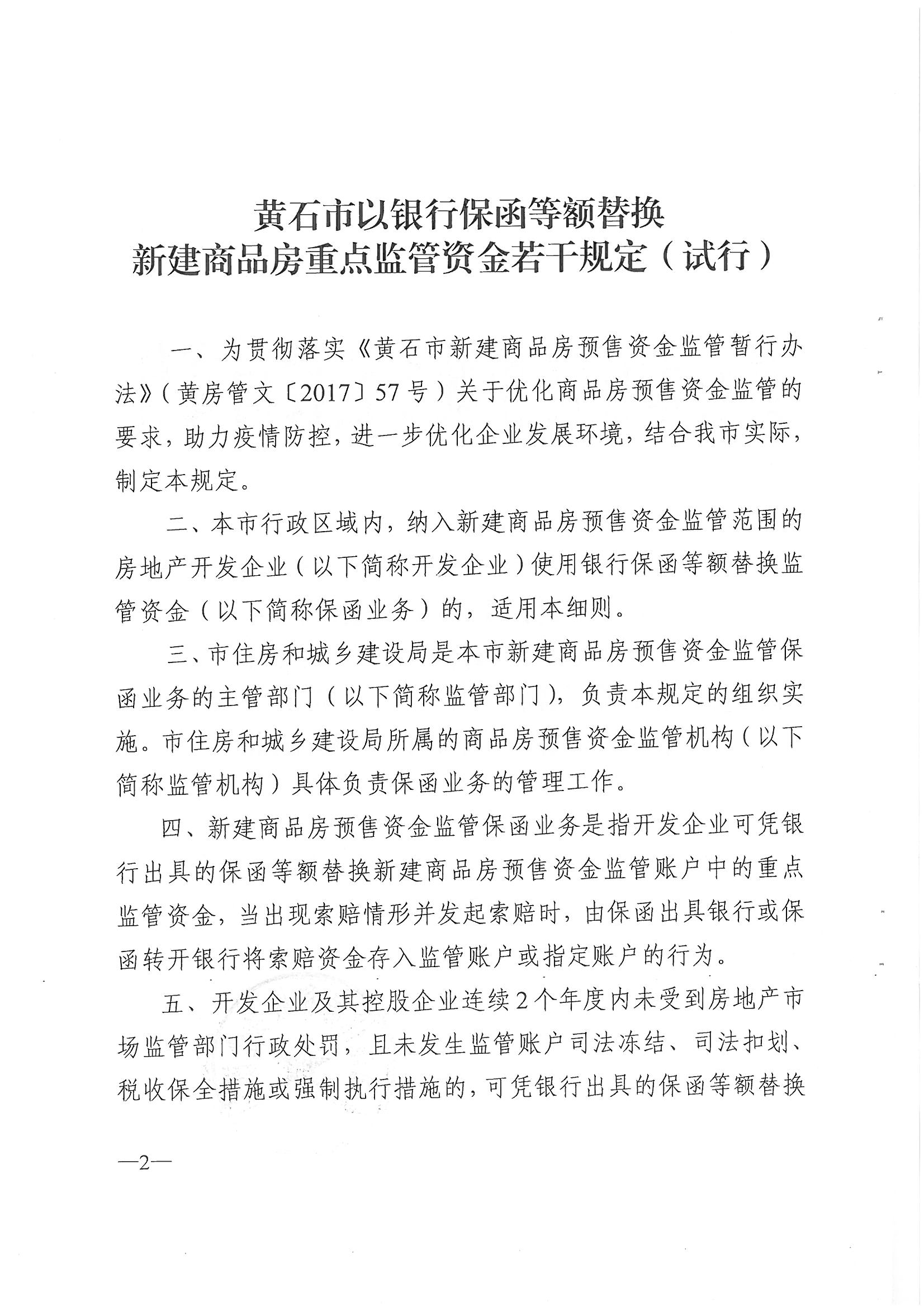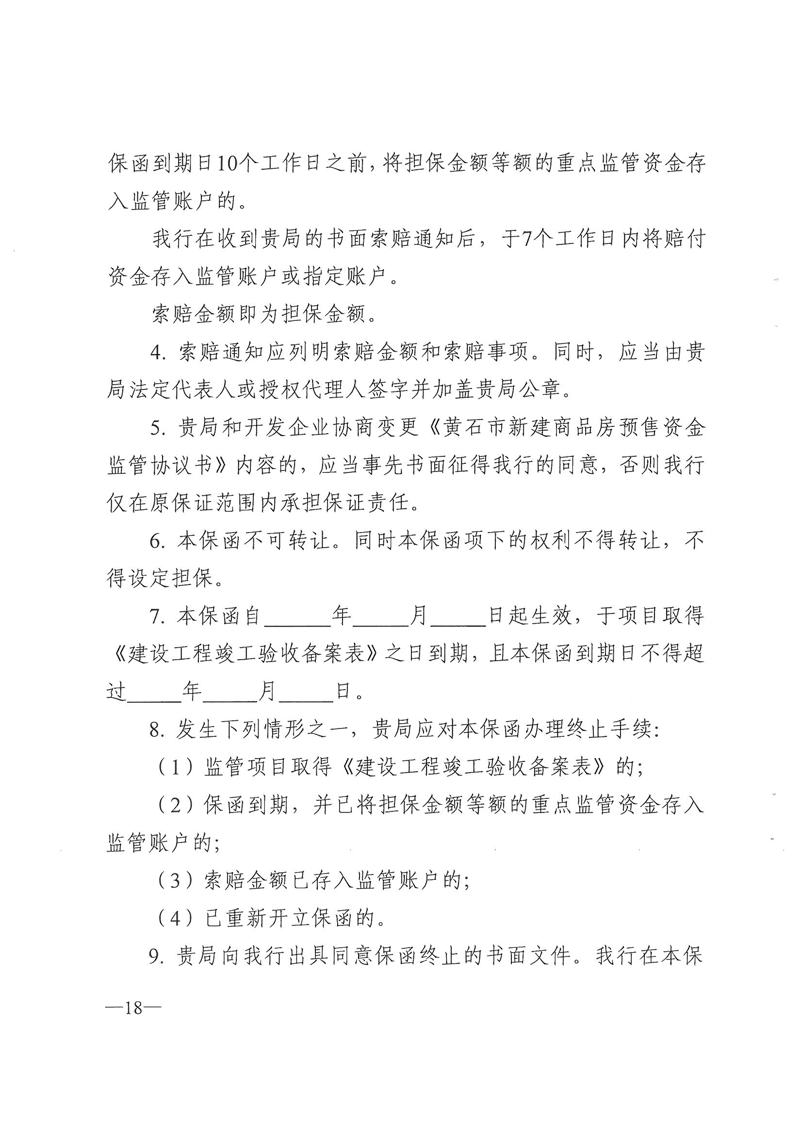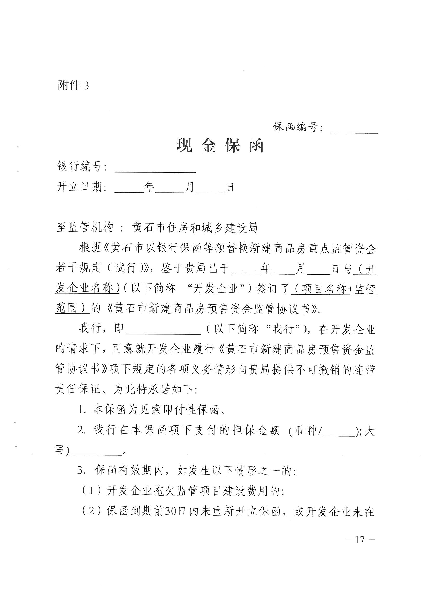 黄石市住房和城乡建设局关于印发《以银行保函等额替换新建商品房重点监管资金若干规定(试行)和操作规范(试行)》的通知