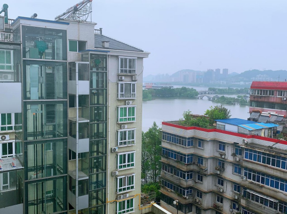 站在9楼楼道平台上,透过蒙蒙细雨,记者看到了不远处的磁湖,目光所及,尽显秀丽清新。